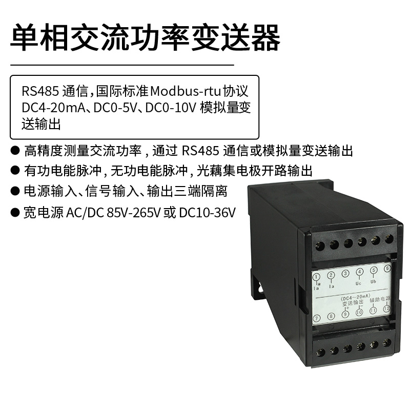 HY194-BS4P1單相交流功率變送器,是一種把功率值隔離轉(zhuǎn)換成線性直流模擬信號輸出或RS485數(shù)字通信接口輸出。模擬量可選:DC0~20mA、DC4~20mA、DC0~5V、DC1~5V、DC0~10V等變送輸出。RS-485數(shù)字通訊接口,采用國際標(biāo)準(zhǔn)MODBUS-RTU通訊協(xié)議,可與各種PLC、HMI、組態(tài)軟件實現(xiàn)組網(wǎng);可選顯示面板,面板采用4位高亮LED 顯示,并帶有3個按鍵用來進(jìn)行參數(shù)設(shè)置。