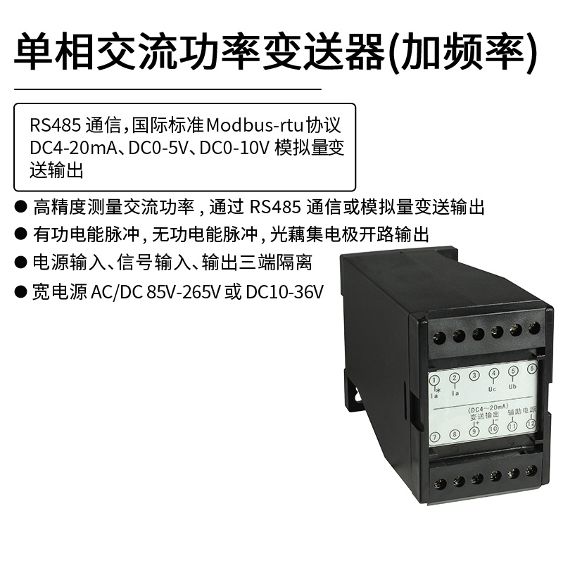 HY194-BS4P1單相交流功率變送器,是一種把功率值隔離轉(zhuǎn)換成線性直流模擬信號輸出或RS485數(shù)字通信接口輸出。模擬量可選:DC0~20mA、DC4~20mA、DC0~5V、DC1~5V、DC0~10V等變送輸出。RS-485數(shù)字通訊接口,采用國際標(biāo)準(zhǔn)MODBUS-RTU通訊協(xié)議,可與各種PLC、HMI、組態(tài)軟件實(shí)現(xiàn)組網(wǎng);可選顯示面板,面板采用4位高亮LED 顯示,并帶有3個(gè)按鍵用來進(jìn)行參數(shù)設(shè)置。