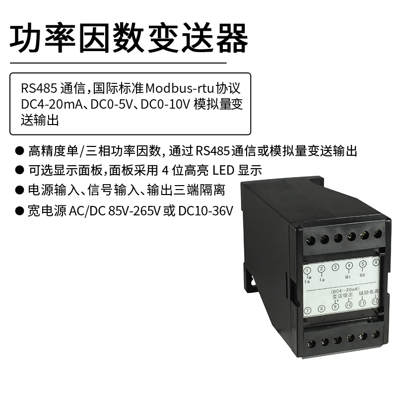 HY194-BS4H功率因數(shù)變送器,是一種把單相功率因數(shù)或三相功率因數(shù)測量值轉(zhuǎn)換成線性直流隔離標準模擬信號輸出或RS485數(shù)字通信接口輸出。模擬量可選:DC0~20mA、DC4~20mA、DC0~5V、DC0~10V等變送輸出。RS-485數(shù)字通訊接口,采用標準MODBUS-RTU通訊協(xié)議,可與各種PLC、HMI、組態(tài)軟件實現(xiàn)組網(wǎng)。