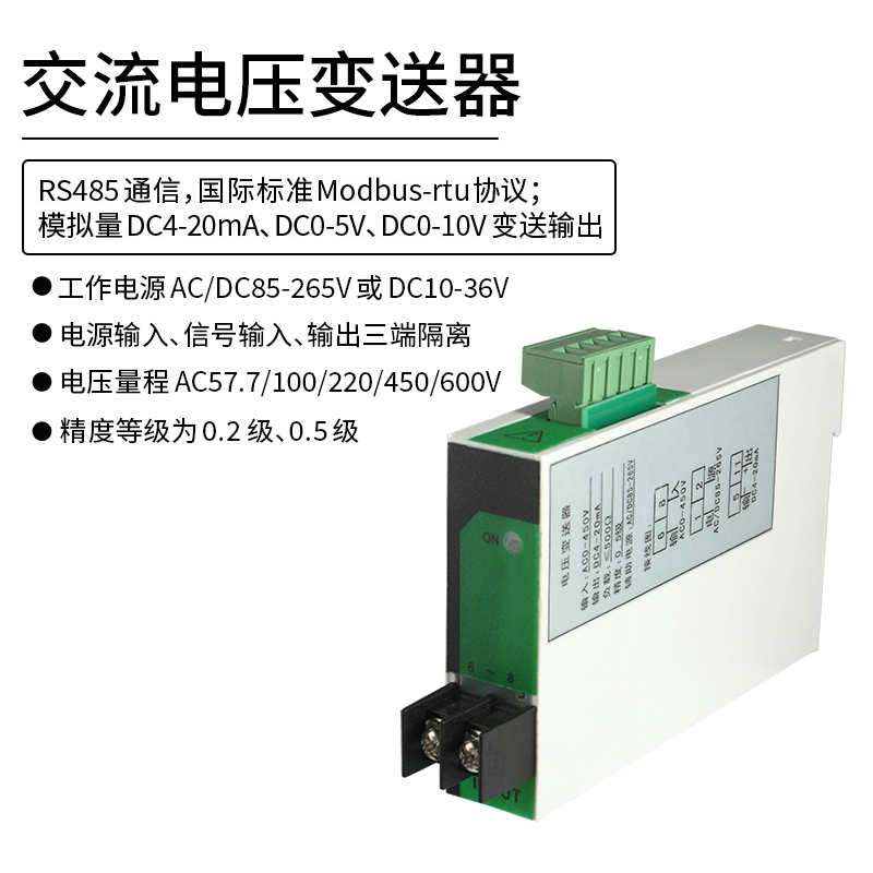 單相交流電壓變送器,是一種將電網(wǎng)中的電壓參數(shù),經(jīng)隔離變送成線性的直流模擬信號(hào)的裝置。模擬量可選:DC0~20mA、DC4~20mA、DC0~5V、DC0~10V等變送輸出。高精度測(cè)量單相交流電壓,精度達(dá)0.5%。RS485通信接口,采用國(guó)際標(biāo)準(zhǔn)Modbus-rtu通訊協(xié)議,可與各種PLC、HMI、組態(tài)軟件實(shí)現(xiàn)組網(wǎng)。