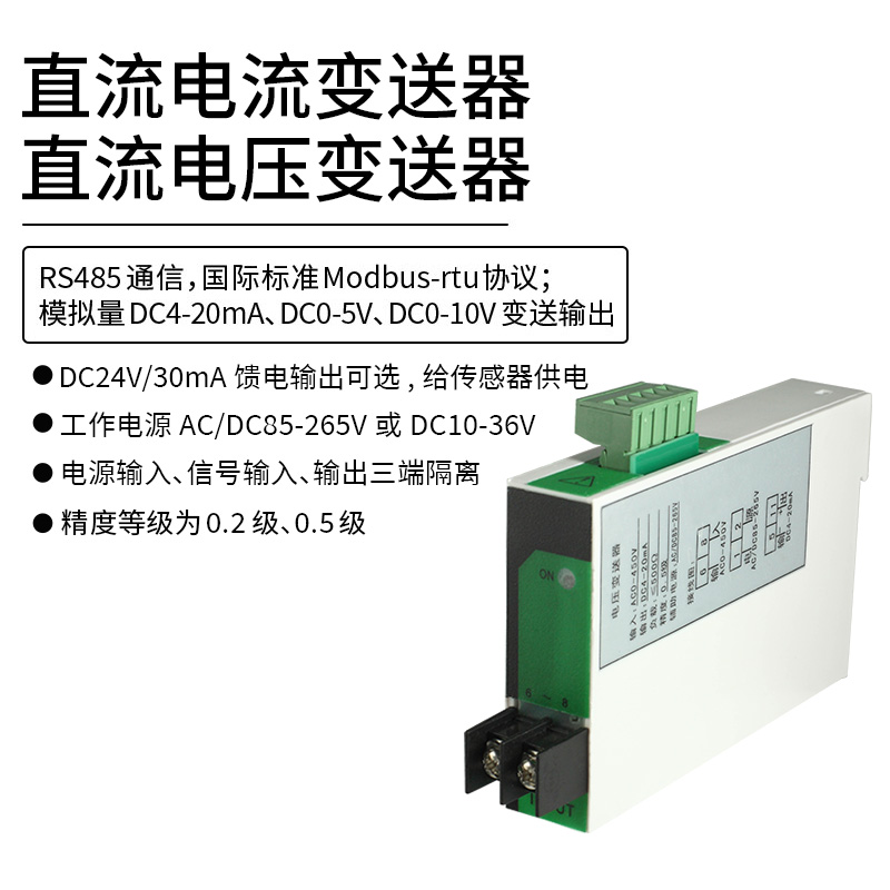 直流電流電壓變送器,是一種將電網(wǎng)中的電流或電壓參數(shù),經(jīng)隔離變送成線性的數(shù)字信號的裝置。模擬量可選:DC0~20mA、DC4~20mA、DC0~5V、DC0~10V等變送輸出。高精度測量直流電流、直流電壓,精度達(dá)0.2%、0.5%。RS485數(shù)字通信接口,采用國際標(biāo)準(zhǔn)Modbus-rtu通訊協(xié)議,可與各種PLC、HMI、組態(tài)軟件實(shí)現(xiàn)組網(wǎng)。