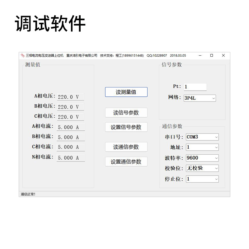 通過(guò)上位機(jī)調(diào)試軟件,可以讀出三相電壓電流測(cè)量值;可以設(shè)置電壓電流變比,接線方式;可以設(shè)置電壓變送器的通信地址,波特率,數(shù)據(jù)格式等。