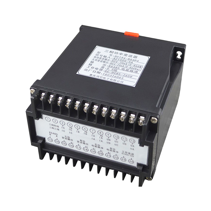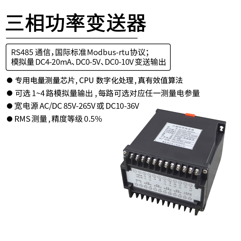 三相功率變送器,通過(guò)專(zhuān)用電量芯片采樣,CPU 數(shù)字化處理,真有效值算法,高精度的測(cè)量有功功率、無(wú)功功率、視在功率、功率因數(shù)、三相電壓、三相電流、頻率、有功電能、無(wú)功電能等,隔離轉(zhuǎn)換成線性直流標(biāo)準(zhǔn)模擬信號(hào)輸出、RS485數(shù)字通信接口輸出或電能脈沖輸出。模擬量可選:DC0~20mA、DC4~20mA、DC0~5V、DC0~10V等變送輸出;RS485數(shù)字通信接口,采用國(guó)際標(biāo)準(zhǔn)Modbus-rtu通訊協(xié)議,可與各種PLC、HMI、組態(tài)軟件實(shí)現(xiàn)組網(wǎng)。最多可選4路模擬量輸出,每路可選對(duì)應(yīng)上面任意一種電參量。有功電能脈沖,無(wú)功電能脈沖輸出,脈沖常數(shù)300~9999可設(shè)。