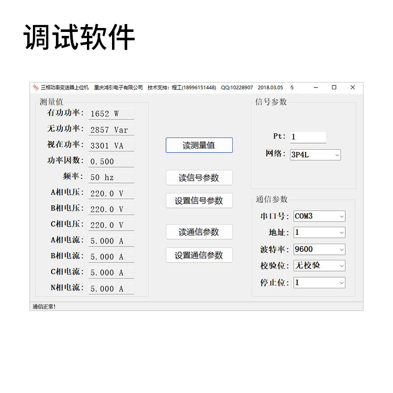 通過(guò)上位機(jī)調(diào)試軟件,可以讀出有功功率,無(wú)功功率,視在功率,功率因數(shù),頻率,三相電壓,三相電流等;可以設(shè)置電壓電流變比,接線方式,電能脈沖常數(shù);可以設(shè)置電壓變送器的通信地址,波特率,數(shù)據(jù)格式等。
