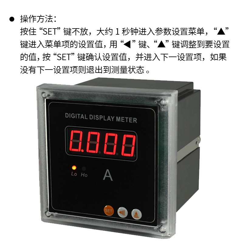 按住“SET”鍵不放,大約1秒鐘進入?yún)?shù)設置菜單,“▲”鍵進入菜單項的設置值,用“?”鍵、“▲”鍵調(diào)整到要設置的值,按“SET”鍵確認設置值,并進入下一設置項,如果沒有下一設置項則退出到測量狀態(tài)。