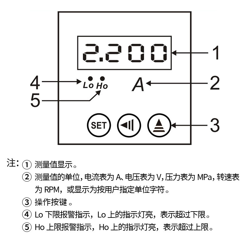 ②、測量值的單位,電流表為A、電壓表為V,壓力表為MPa,轉(zhuǎn)速表為RPM,或顯示為按用戶指定顯示單位。