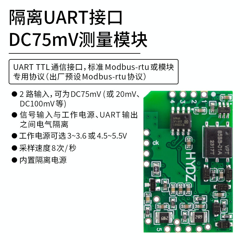 隔離DC20mV、DC75mV、DC100mV等測量模塊,集成高精度ADC、32位ARM單片機、信號調(diào)理電路、數(shù)字隔離電路和隔離電源電路于一體(模塊內(nèi)部集成了隔離電源),易于集成到各種測量設(shè)備中;同時進行2路信號測量,只需接入要測量的DC20mV、DC75mV、DC100mV信號;模塊通過隔離UART TTL接口與外部通信,進行測量數(shù)據(jù)輸出和參數(shù)設(shè)置;通信支持2種通信協(xié)議,1、模塊專用協(xié)議,2、標(biāo)準(zhǔn)modbus rtu協(xié)議。通信波特率:2400、4800、9600、19200、38000、57600、115200用戶可設(shè)。工作電源5V或3.3V(用戶定貨時說明),信號輸入與通信輸出和電源電氣隔離。