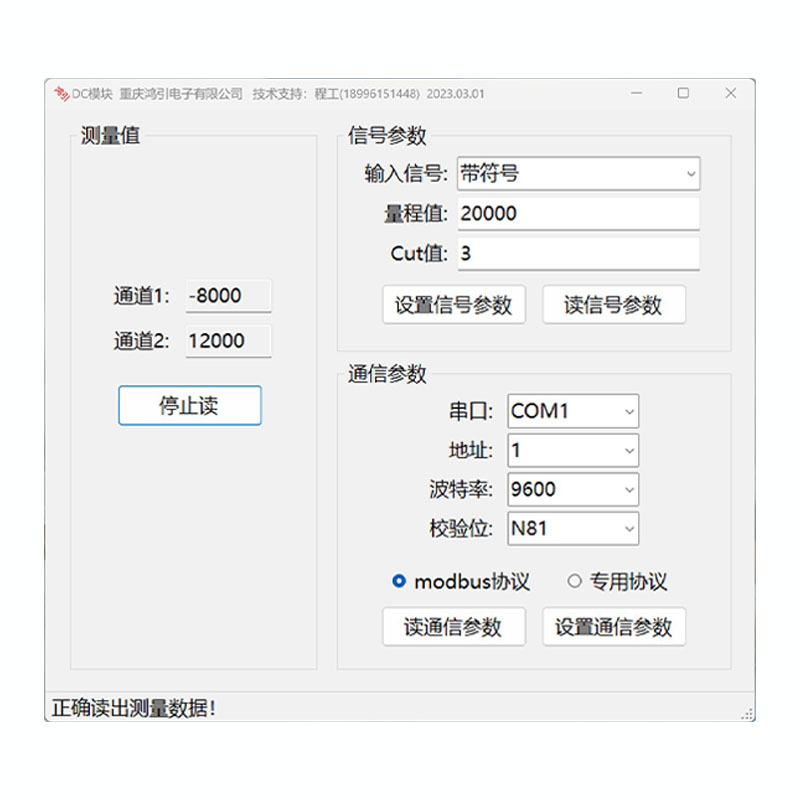 (1) 讀測量值,輸入信號為±75V,量程20000,通道1輸入-30mV,通道2輸入45V,RS485地址1: